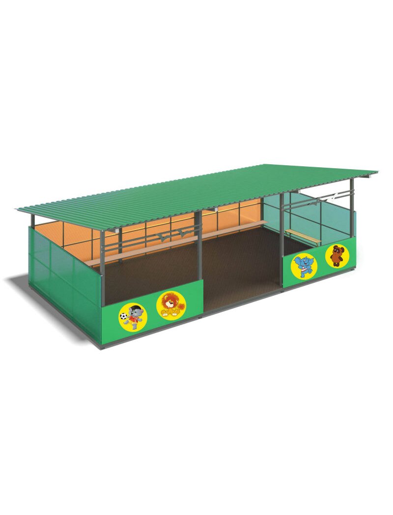 Полноразмерная веранда ЭКО СТИЛЬ - это безопасное пространство для детей, оформленное из натуральных материалов (дерево, фанера), имитирующее природную среду. Веранда расширяет игровую площадь, обеспечивая комфорт на свежем воздухе. Предназначена для развития, активного отдыха и занятий на свежем воздухе. Габаритный расчётный размер: по полу - 5 * 8 м, высота 2,6 м (сзади - 2,1 м). Пол - деревянный, половая доска 36 мм. Облицовка крыши - кровельный профнастил НС35. Облицовка стен сотовым поликарбонатом 8-10 мм. Веранда идет с ограждением впереди (фанера или сотовый ПК). Цветовое решение -различное.