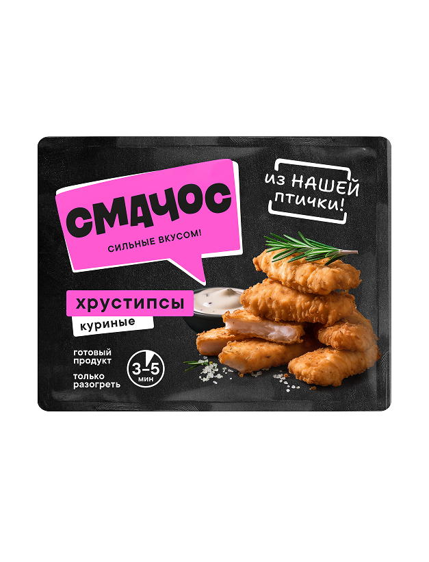 Хрустипсы Смачос — это кусочки рубленного куриного филе в нежной панировке. Их вкусно есть как закуску в компании друзей или в качестве основного блюда, добавив любимый гарнир.