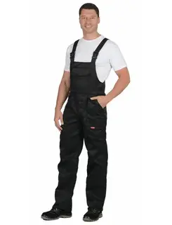 Полукомбинезон рабочий черный с боковыми застежками на пуговицы с двумя боковыми и одним нагрудным карманами.