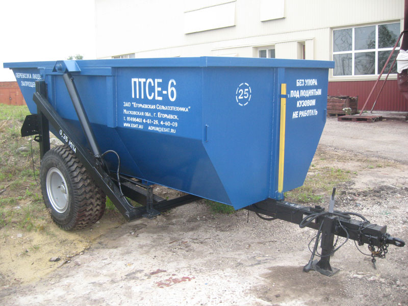 Полуприцеп тракторный самосвальный ПТСЕ-6 предназначен для перевозки и выгрузки назад любых жидких, полужидких и сыпучих сельскохозяйственных и строительных грузов по дорогам общей сети и в полевых условиях. Полуприцеп является универсальным, всесезонным транспортным средством и кроме традиционых сельскохозяйственных грузов может транспортировать и разгружать жидкие и полужидкие удобрения, строительные растворы и асфальтобетонные смеси. Полуприцеп агрегатируется с колёсными тракторами тягового класса 1,4т...2.0тс.