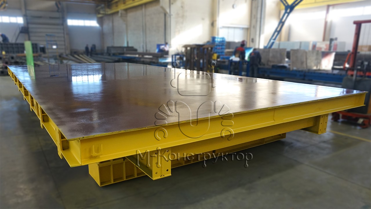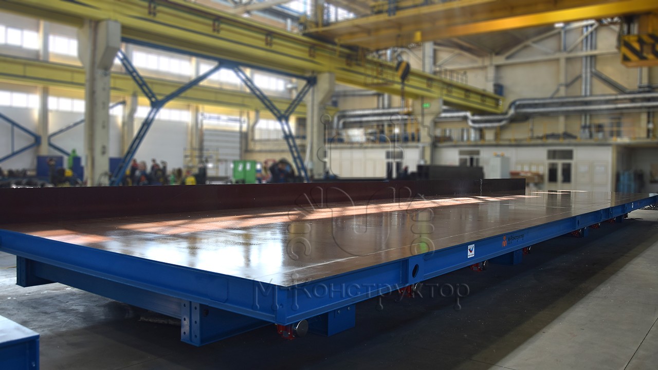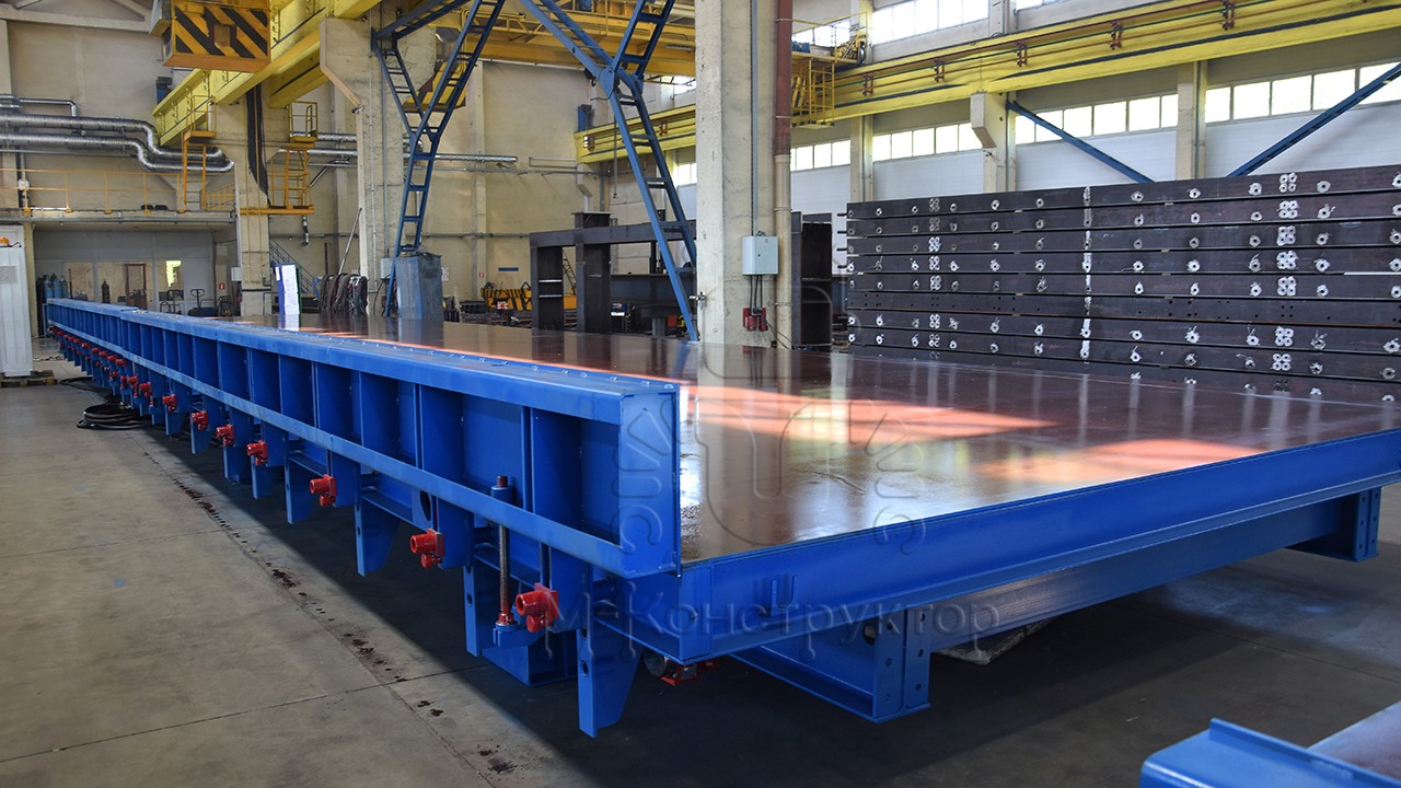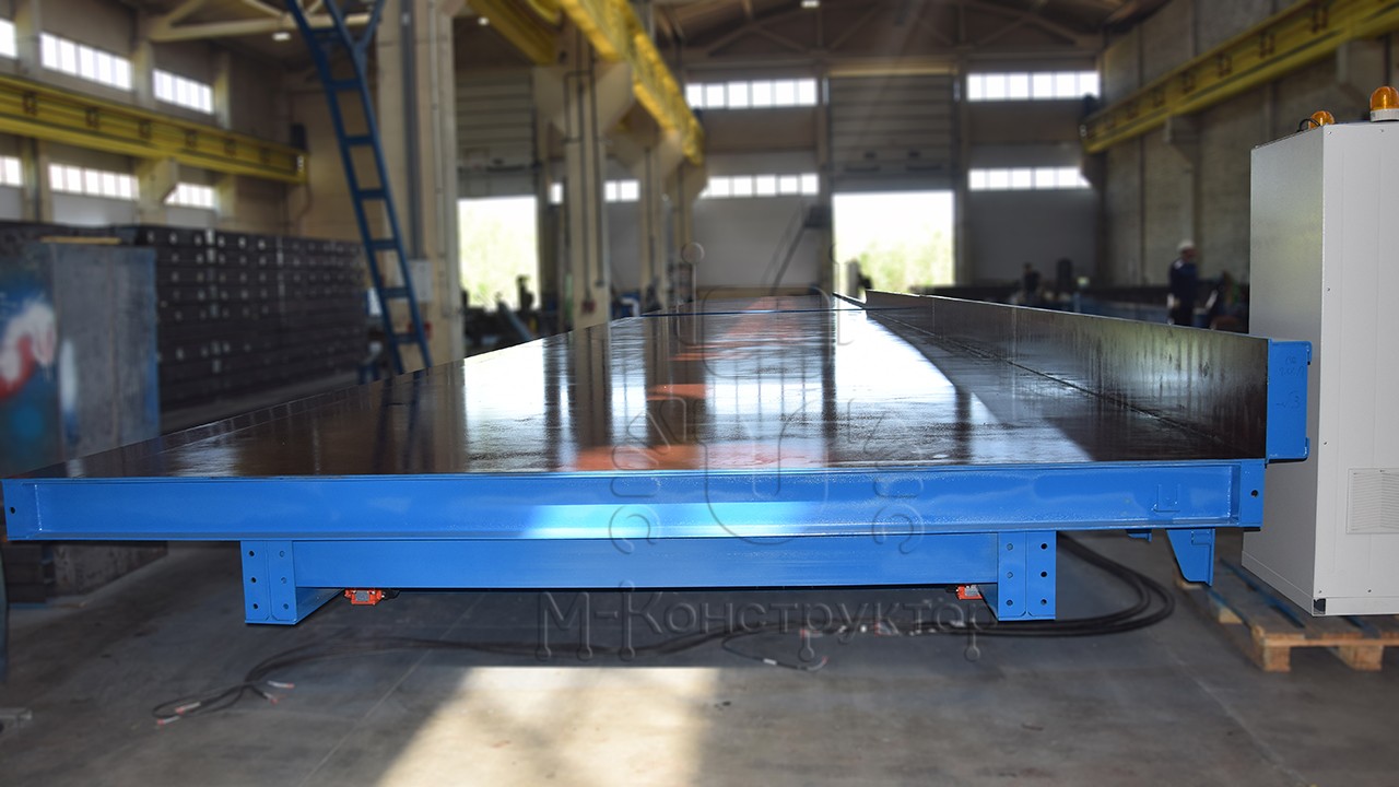 Допустимая нагрузка на стол – 1000 кг/кв. м. Поверхность стола выполнена из высокопрочной стали толщиной 10 мм, ширина поверхности может достигать 4 м, длина 12 м.