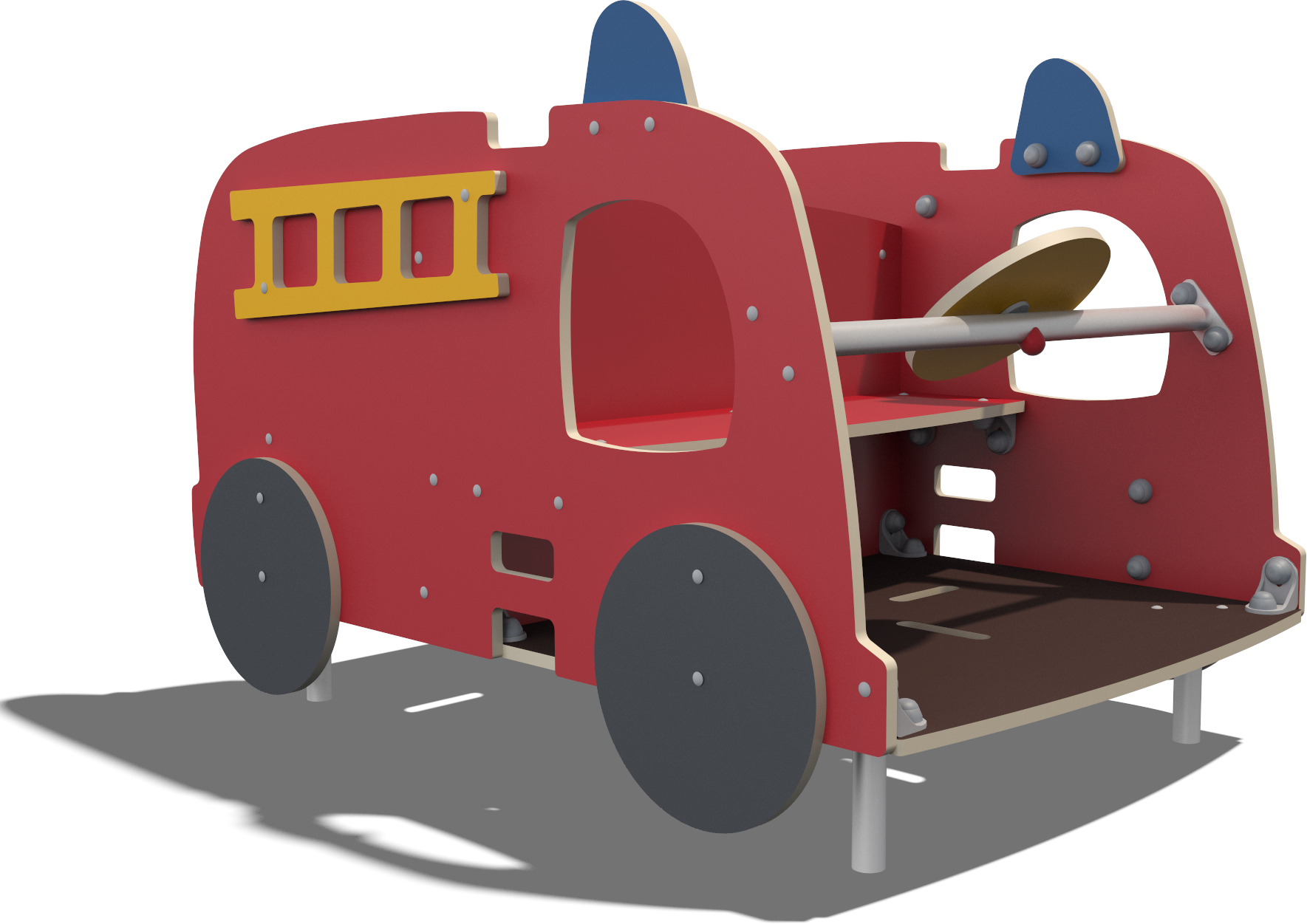 Пожарная машинка ДС012 - это уличный игровой транспорт, предназначенный для игры детей, имитирующий пожарную машину, который служит для развития воображения и сюжетно-ролевых игр детей, помогая им в игровой форме познакомиться с профессией пожарного. Каркас пожарной машинки выполнен из боковых панелей и панели основания, которые установлены на опорных стойках в количестве 4 шт. Боковые панели, две панели лестница-декор, две мигалки, 4 колеса, опора и сиденье (по 2 шт.), руль, сиденье со спинкой для водителя, декоративные элементы изготовлены из влагостойкой ламинированной фанеры FOF толщиной не менее 15 мм. Кромки фанеры закруглены и шлифованы. Габариты машинки - 1,22 *0,85* 0,85 м. Размеры площадки для установки - не менее 3,85*4,22 м. Игровое оборудование рассчитано на возраст - от 3 до 6 лет.