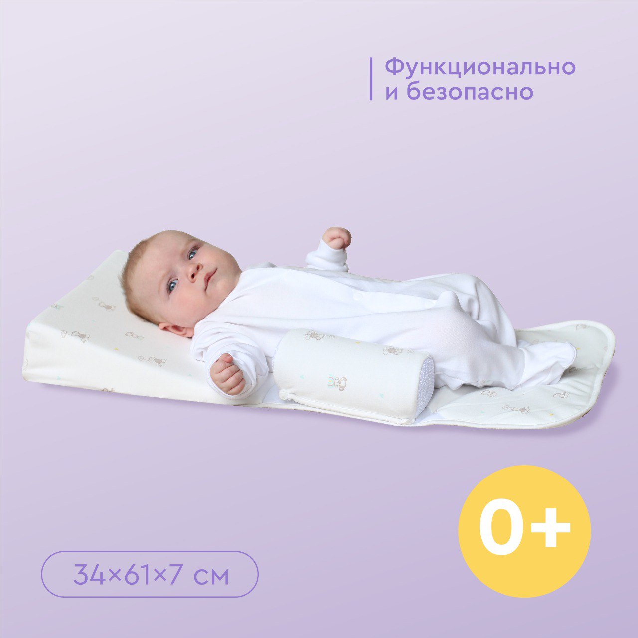 Позиционер 3 в 1 для новорождённых необходим младенцам, склонным к частым срыгиваниям и непроизвольным движениям. Упругая анатомическая подушка обеспечивает ребёнку приподнятое положение тела, защищая его при срыгиваниях, а боковые валики комфортно и нежно фиксируют малыша, предупреждая скатывания и переворачивания. Все элементы позиционера покрыты чехлами из нежного натурального хлопка и имеют мягкий наполнитель, не вызывающий аллергии. При необходимости чехлы и мягкий матрасик позиционера можно постирать в стиральной машине. В комплект входит: треугольная подушка-позиционер из упругого пенополиуретана, приподнимающая ребенка, боковые валики для поддержки ребенка, препятствующие переворачиванию во время сна, тонкий мягкий матрасик из 100% хлопка, наполнитель - синтепон. Размеры: матрасик - 34*50 см., валики - 17.5*6.5 см., позиционер - 34*30*7 см.