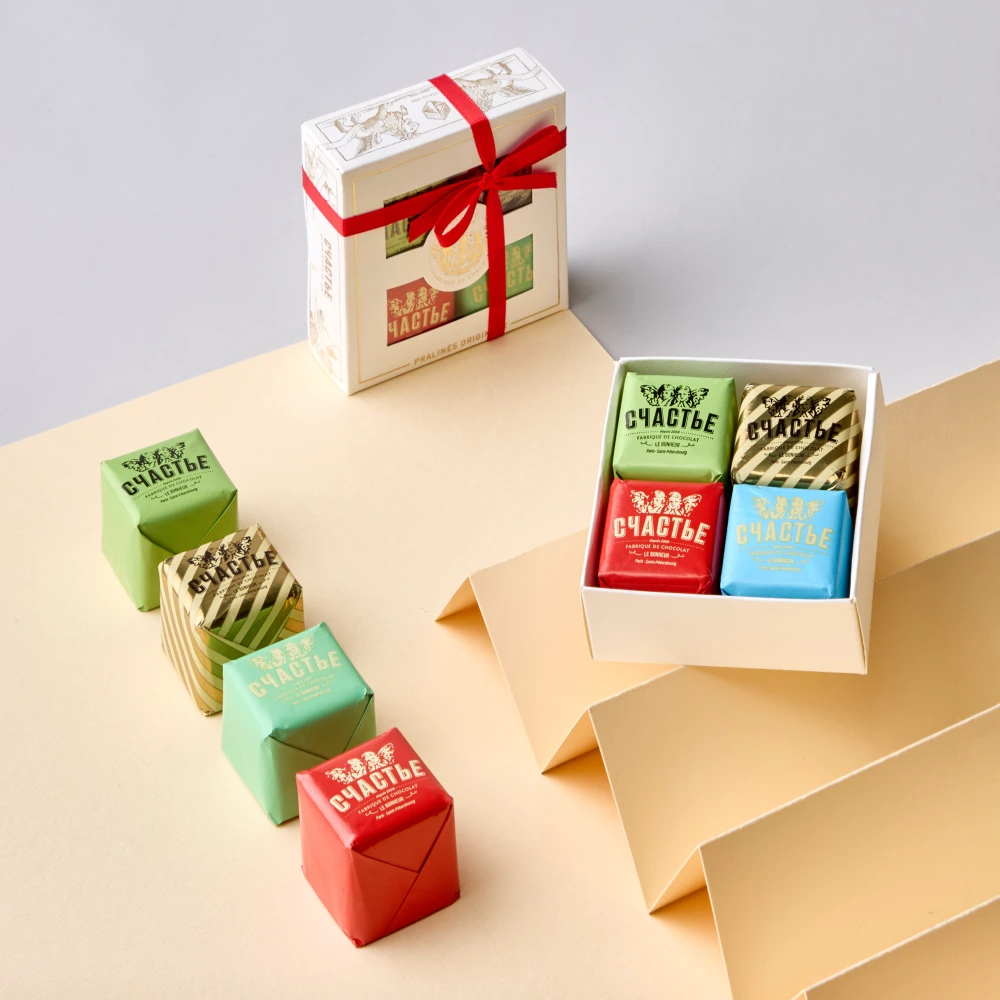 Коллекция пралине 4 шт ассорти от конфетной фабрики «Счастье», созданными вручную по уникальному рецепту 2008 года.