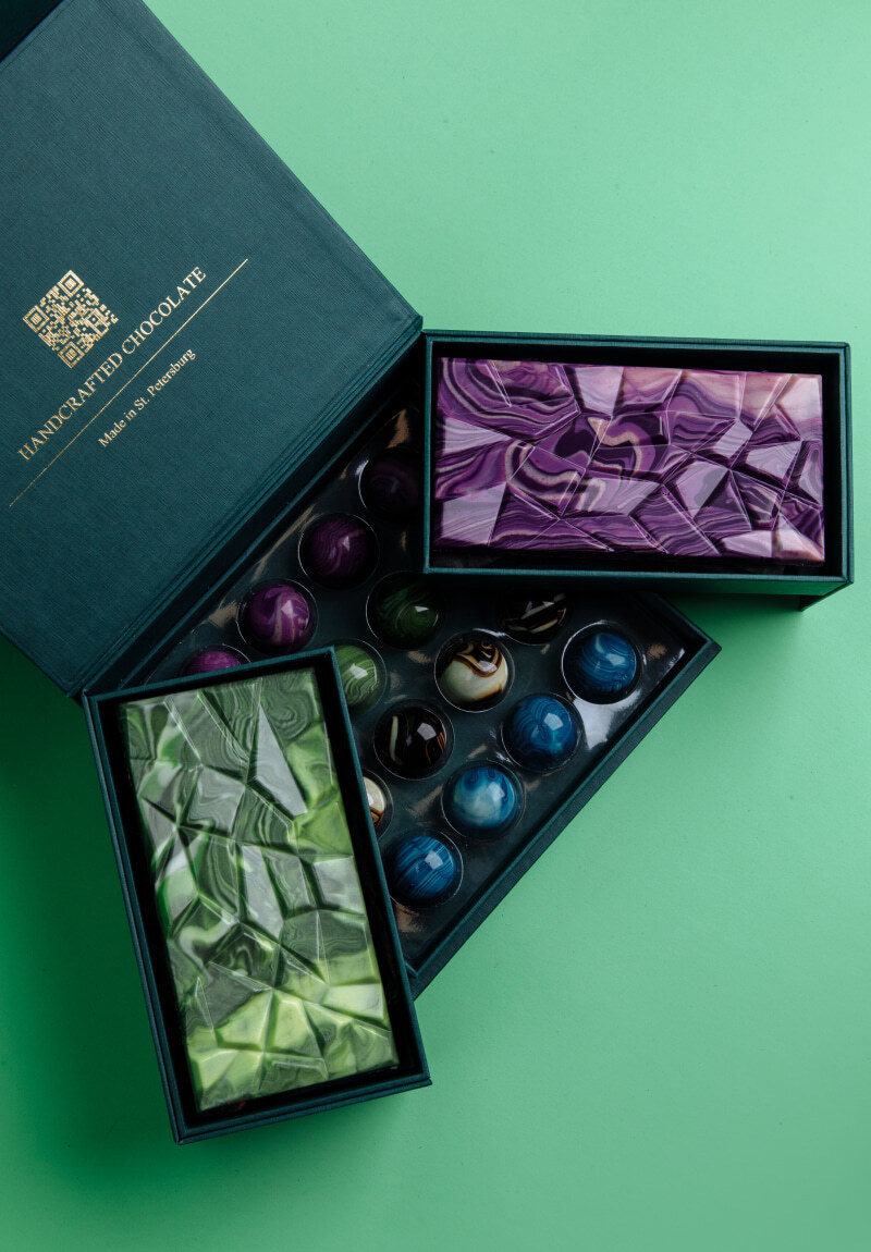 Декор набора вдохновлён природными камнями и минералами. Особая техника изготовления делает каждую конфету неповторимой.