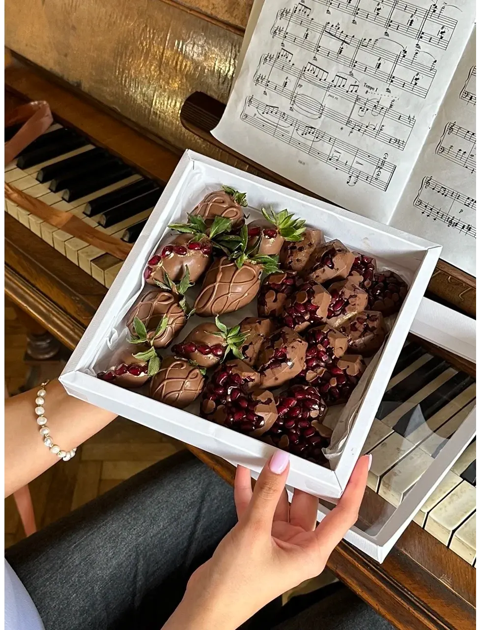 Клубника отборная, молочный бельгийский шоколад, зерна граната.