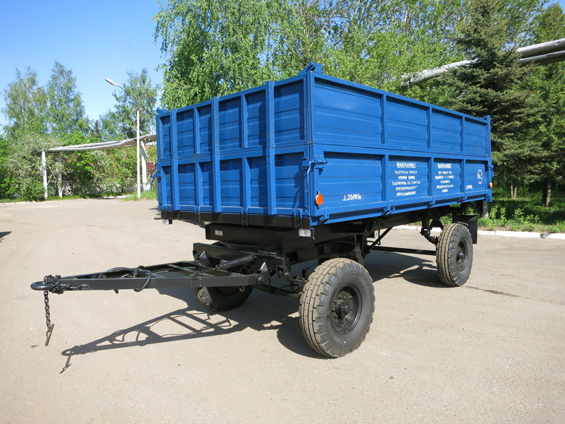 Назначение: прицеп тракторный самосвальный 2 ПТС-4,5 предназначен для перевозки различных сельскохозяйственных и сыпучих строительных грузов по дорогам общей сети и в полевых условиях. Разгрузка прицепа трёхсторонняя. Прицеп агрегатируется с колёсными тракторами тягового класса 1,4т оборудованными раздельно-агрегатной гидросистемой, имеющими тягово-сцепное устройство по ГОСТ 2349, а также выводы для подключения тормозной пневмосистемы и электрооборудования.