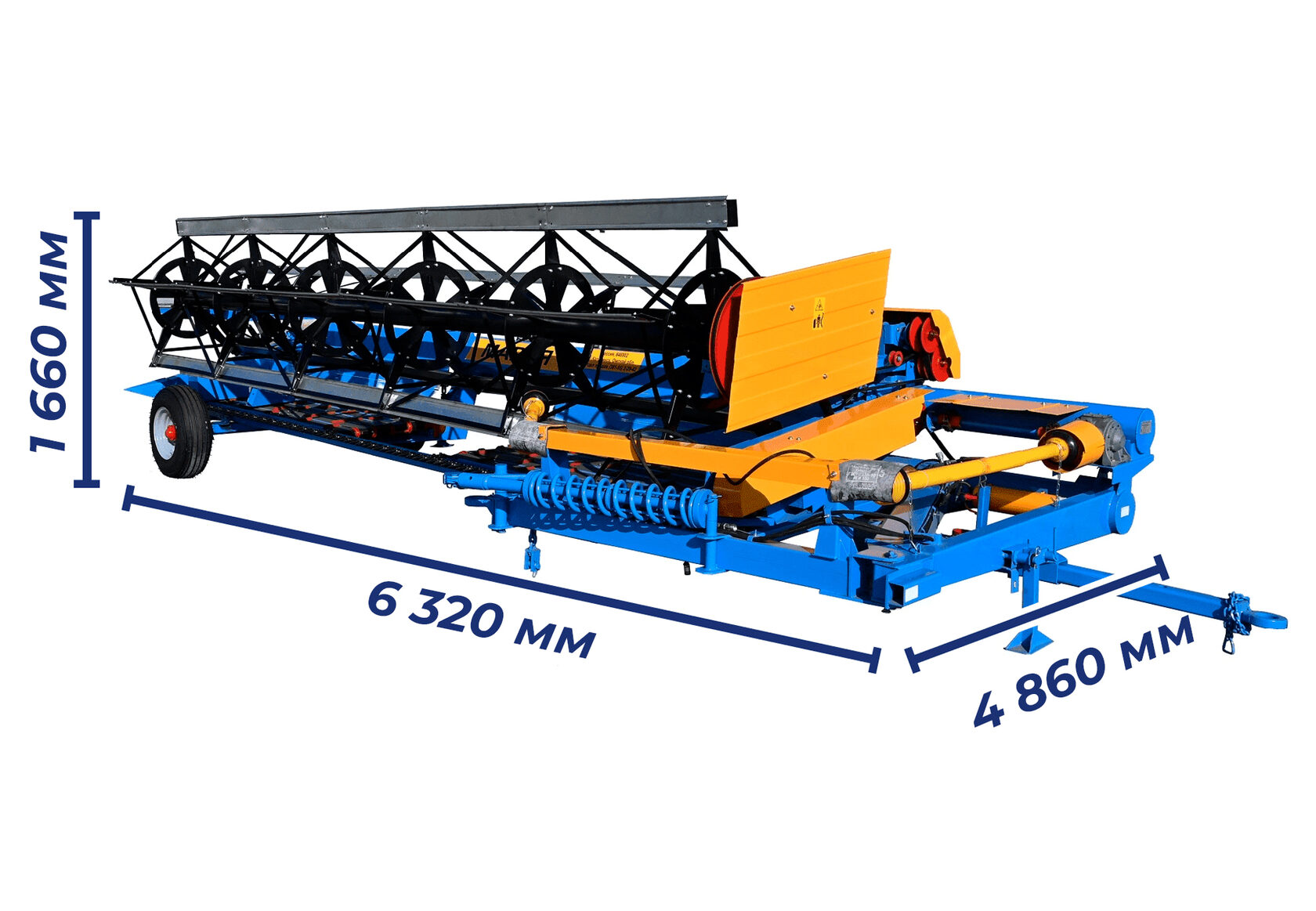 Прицепная жатка ЖВП-5,1 предназначена для уборки зерновых колосовых культур и трав в степных и лесостепных регионах с укладкой в валок. Отличительной особенностью прицепной жатки ЖВП-5,1 является использование в конструкции современной режущей системы среза Шумахера (Германия) с планетарным редуктором.Агрегатируется с тракторами классов 1,4-3,0 (МТЗ-82; ЛТЗ-95; ХТЗ-121, ЮМЗ). Транспортеры жатки ременно-планчатые, пятиручьевые. Выгрузное окно в центре жатки. Скошенная масса послу уборки укладывается на стерню так, что колосья располагаются сверху валка, что способствует ускорению дозревания зерна и его просушки после дождя. Подъем жатки для перестановки ходовых колес в рабочее/транспортное положение во время уборочной компании для удобства производится гидродомкратом. Рабочий захват 5,1 м., высота среза - 80-250 мм., сменная выработка до 32 Га., рабочая скорость 10 км/ч