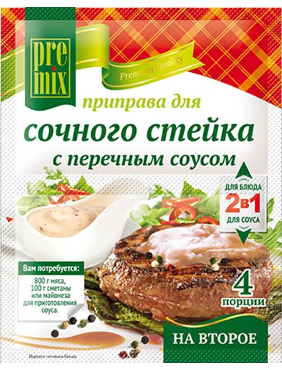 Приправа для сочного стейка с перечным соусом PreMix – приправа 2 в 1 – это две смеси в одной упаковке! Сбалансированная приправа с базиликом, тмином и другими пряностями идеально оттенит вкусовые и ароматические свойства стейка, а перечный соус добавит пикантную остроту. Возьмите на заметку наш рецепт на упаковке. Приправа используется при приготовлении говядины, свинины, баранины. Мы гарантируем вам вкусные и изысканные ужины!