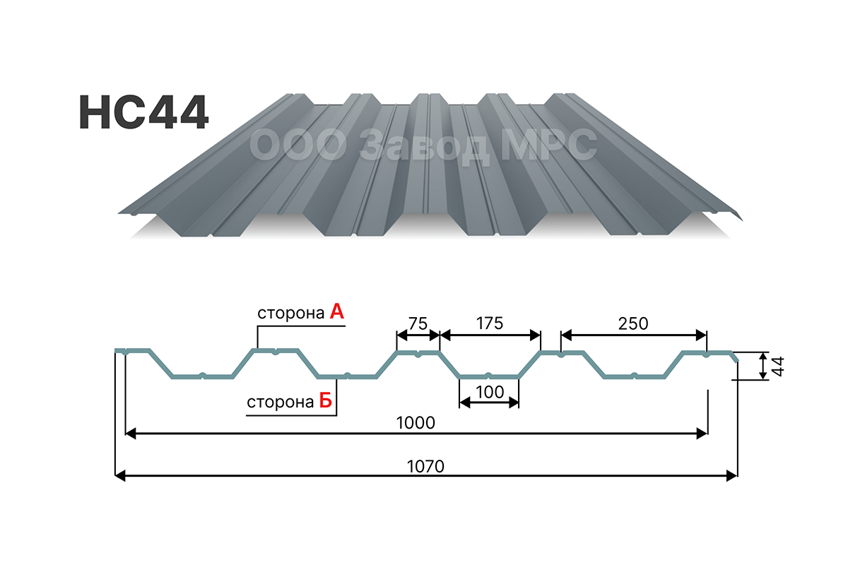 Профлист НС44 производства компании «МРС» изготавливается на основе российской стали марок 01 и 220 ведущих сталелитейных заводов. Профнастил соответствует ГОСТ 24045-94. Срок службы - до 30 лет. Размеры профлиста НС44 с листа – 1 000/ 1 070 (полезная монтажная/ общая ширина). Длина профиля – до 14 м с любой кратностью реза.