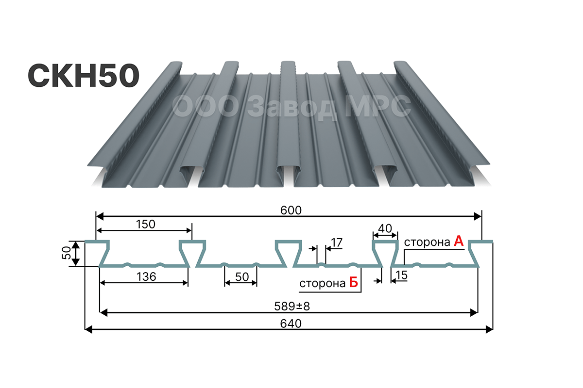 Профлист СКН50 имеет трапециевидный профиль высотой 50 мм. Рабочая ширина – 600 мм, габаритная – 640 мм. Длина листа – от 2 до 12 м, толщина – от 0,6 до 1,2 мм. Кратность реза – любая. При изготовлении профилированного листа на заводе «МРС» используется российский стальной прокат заводов «НЛМК», «Северсталь», «Магнитогорский металлургический комбинат». На изделия действует гарантия сроком до 30 лет.