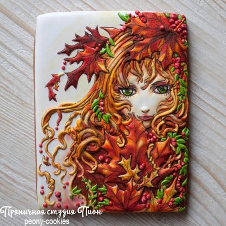 Пряничная картина Девушка-Осень. Выполнена вручную, сахарной глазурью, объемный рисунок в технике пайпинг. Тонировка и прорисовка кистью и пищевыми красителями.