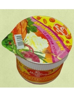 Картофельное пюре быстрого приготовления со вкусом курицы в стакане понравится многим любителям вкусных продуктов. Нежное пюре с пикантным куриным вкусом не оставит равнодушным никого. Пластиковый стаканчик делает картофель быстрого приготовления достаточно удобным вариантом для тех людей, которые привыкли много путешествовать. В стаканчик нужно всего лишь добавить кипяток – и Ваш ужин, завтрак или обед готов! 40 грамм – этого вполне достаточно для того, чтобы вкусно поесть одному человеку, получив при этом необходимый заряд энергии. Картофель со вкусом курицы напоминает домашнюю кухню, так как приготовлен с такой же любовью и заботой.