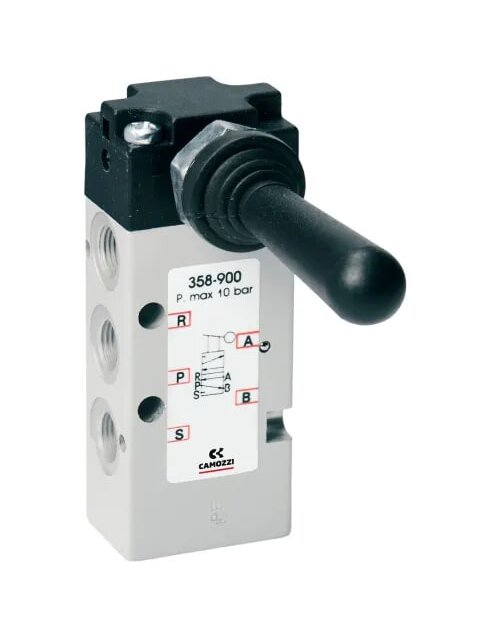 Распределитель Camozzi 358-905 с ручным управлением, 5/2 лин./поз. моностабильный с пружинным возвратом. Боковой тумблер - джойстик подпружиненный. Присоединение: G1/8