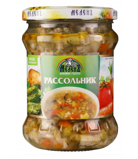 Состав: овощи (огурцы солёные, картофель, морковь, лук), вода, перловая крупа, паста томатная, мука пшеничная, масло растительное подсолнечное, загуститель крахмал картофельный, сахар, соль, чеснок сушёный, перец душистый молотый, перец чёрный молотый, укроп сушёный, лук зелёный сушёный