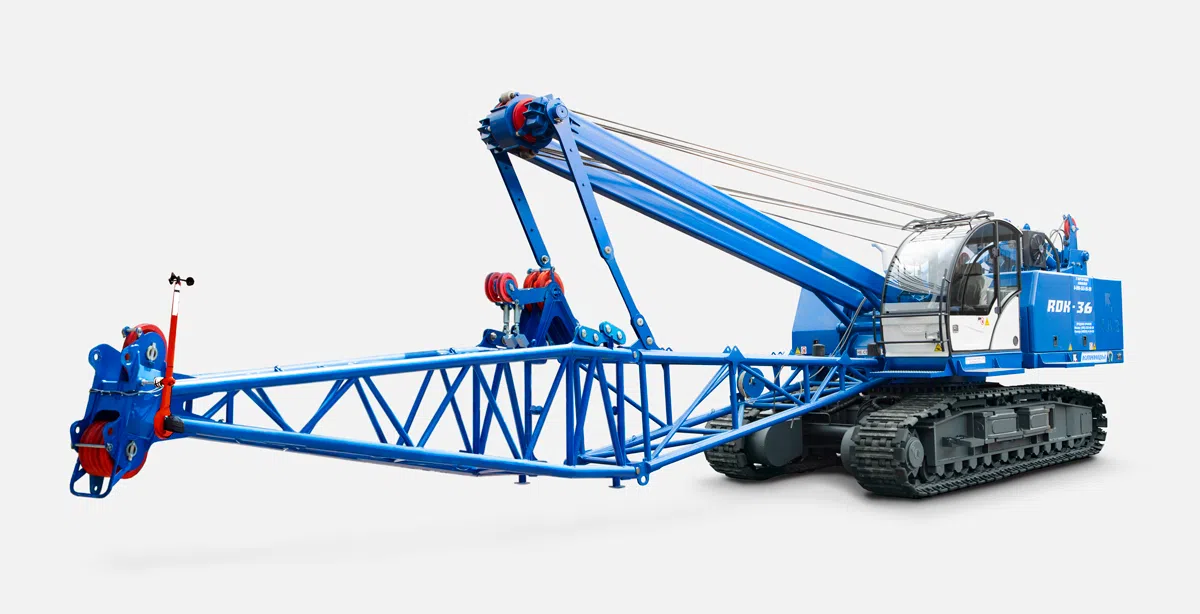 RDK-36 - стреловой, самоходный, полноповоротный гусеничный кран RDK-36 предназначен для погрузочно-разгрузочных и строительно-монтажных работ с преимущественным использованием на стационарных объектах без частых перебазировок на большие расстояния. Простота и надежность конструкции, а так же преимущества использования гусеничного хода позволяют применять данный кран в тяжелых условиях на неподготовленных площадках. Привод гусеничной ходовой части и всех механизмов крана — гидравлический. Каждый механизм имеет индивидуальный привод с независимым управлением. Гидравлическая система обеспечивает плавное управление всеми механизмам и с широким диапазоном регулирования скоростей рабочих операций, давая возможность одновременного совмещения нескольких операций. Грузоподъемность максимальная - 36 тонн.
