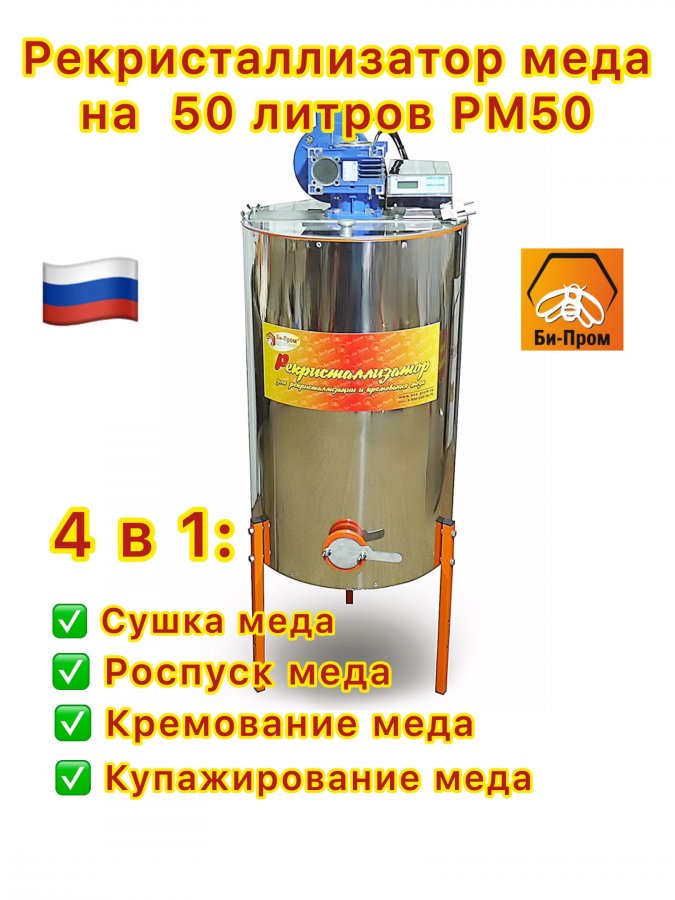 Рекристаллизатор РМ-50 - это многофункциональное оборудование для пчеловодов, предназначенное для обработки мёда: роспуска, сушки, купажирования, кремования (получения крем-мёда) и фасовки, с объёмом бака 50 литров, позволяющее бережно нагревать и перемешивать мёд для получения высококачественного продукта. Диаметр - 440 мм. Высота без ножек - 1040 мм. Высота с ножками - 1240 мм. Крышка изготовлена из орг. стекла. Вес -30 кг. Напряжение питания - 220В. Мощность эл. двигателя - 370Вт. Нагревательный элемент расположен в стенках и дне корпуса. Мощность нагревательного элемента - 500Вт. Температура нагрева регулируется - от 0 до 90°C. Винт выполнен из пищевой нержавеющей стали. Скорость вращения винта регулируется - от 8,8 до 22 об/мин.
