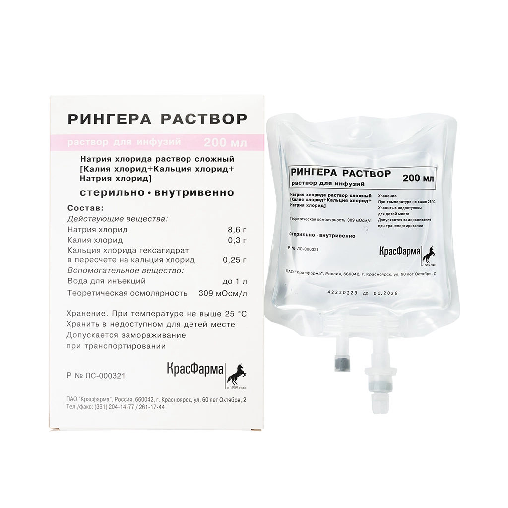 Рингера раствор - это сбалансированный полиионный кристаллоидный раствор, изотоничный плазме крови, содержащий ионы натрия, калия, кальция и хлора. Он применяется для регидратации, восполнения дефицита электролитов, дезинтоксикации и кратковременного замещения объема крови при шоке, ожогах, рвоте и диарее. Поставляется в стеклянных или полимерных флаконах/контейнерах по 100, 200, 250, 400, 500 и 1000 мл.