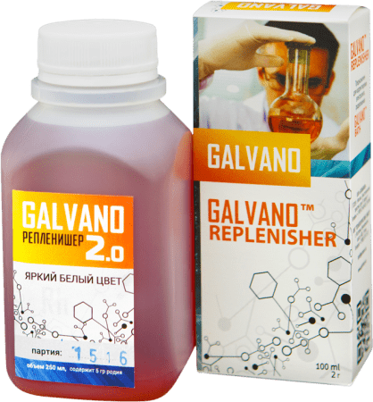 Раствор GALVANO 2.0 репленишер предназначен для корректировки концентрации рабочих компонентов ванны родирования GALVANO BATH. Это позволяет не только осаждать на поверхность изделий весь приобретаемый родий, но и постоянно поддерживать оптимальный состав раствора, обеспечивая тем самым стабильный яркий белый цвет покрытия.