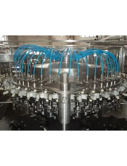 Роторный ополаскиватель бутылок для очистки внутренней поверхности тары перед розливом продукции. Задача — удалить пыль, микрочастицы, остатки производственных материалов и другие загрязнения из бутылок перед наполнением продуктом. Представляет собой карусельную систему с вращающимся барабаном, на котором закреплены захваты для бутылок.Тара движется по кругу, проходя все стадии обработки.Обычно двухканальный, что позволяет промывать бутылку двумя жидкостями через две независимые форсунки для каждой бутылки.