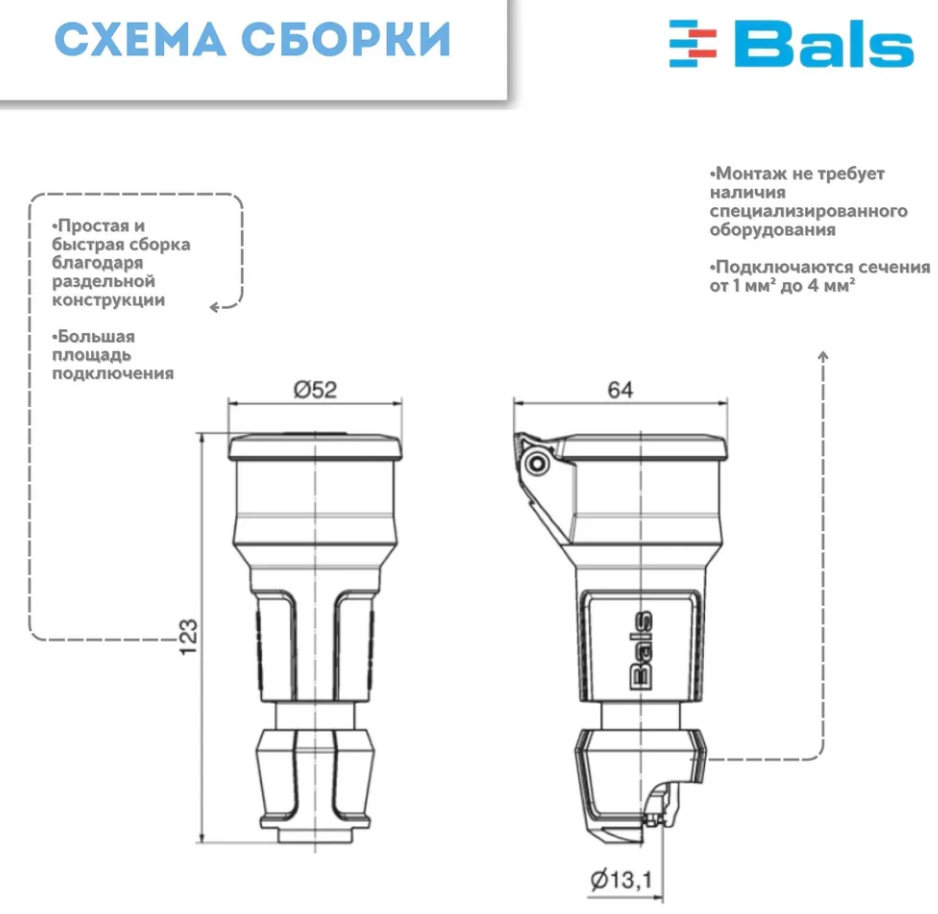 Продукция Bals выполнена из полиамида с контактами из никелированной латуни, гарантируя влагоустойчивость и ударопрочность при подключении даже в самых сложных условиях эксплуатации и сохраняя устойчивость к разрыву, истиранию и химическим воздействиям.