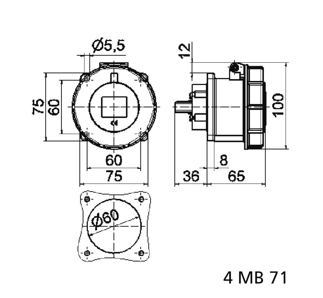 РОЗЕТКА ВСТРАИВАЕМАЯ 32A 4П(3P+PE) 3Ч, 380-440В, IP67 ФЛАНЕЦ 75Х75 BALS 13021 (РЕФ)