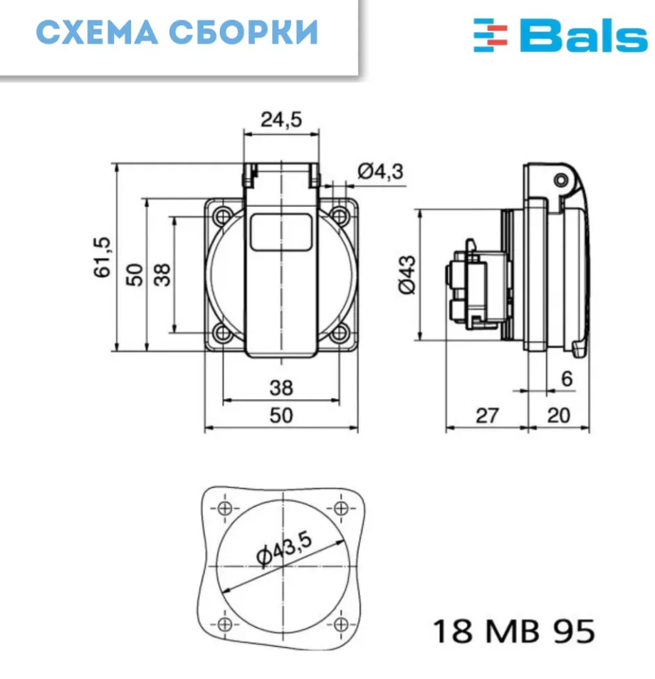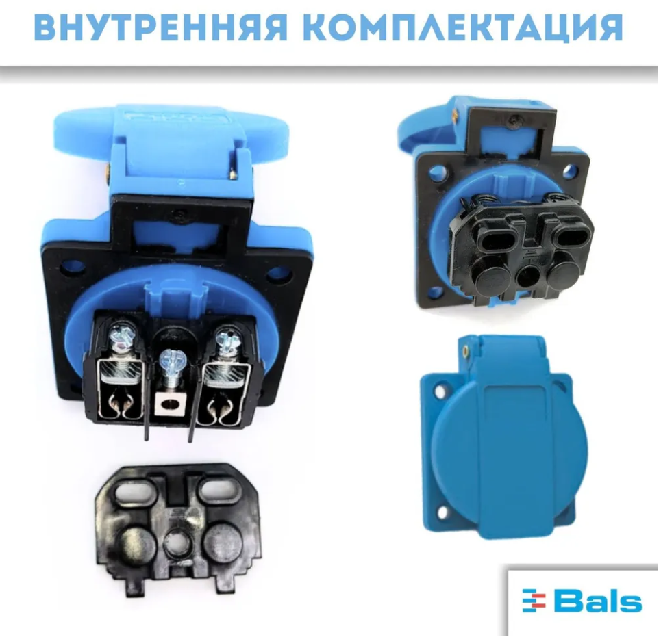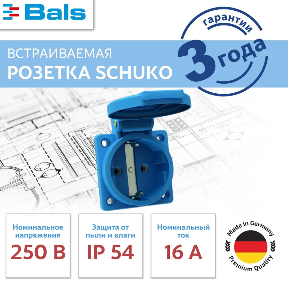 Розетка встраиваемая Schuko 16A, с напряжением 250V, IP54, Bals; ударопрочная; влагоустойчивая, с заземлением