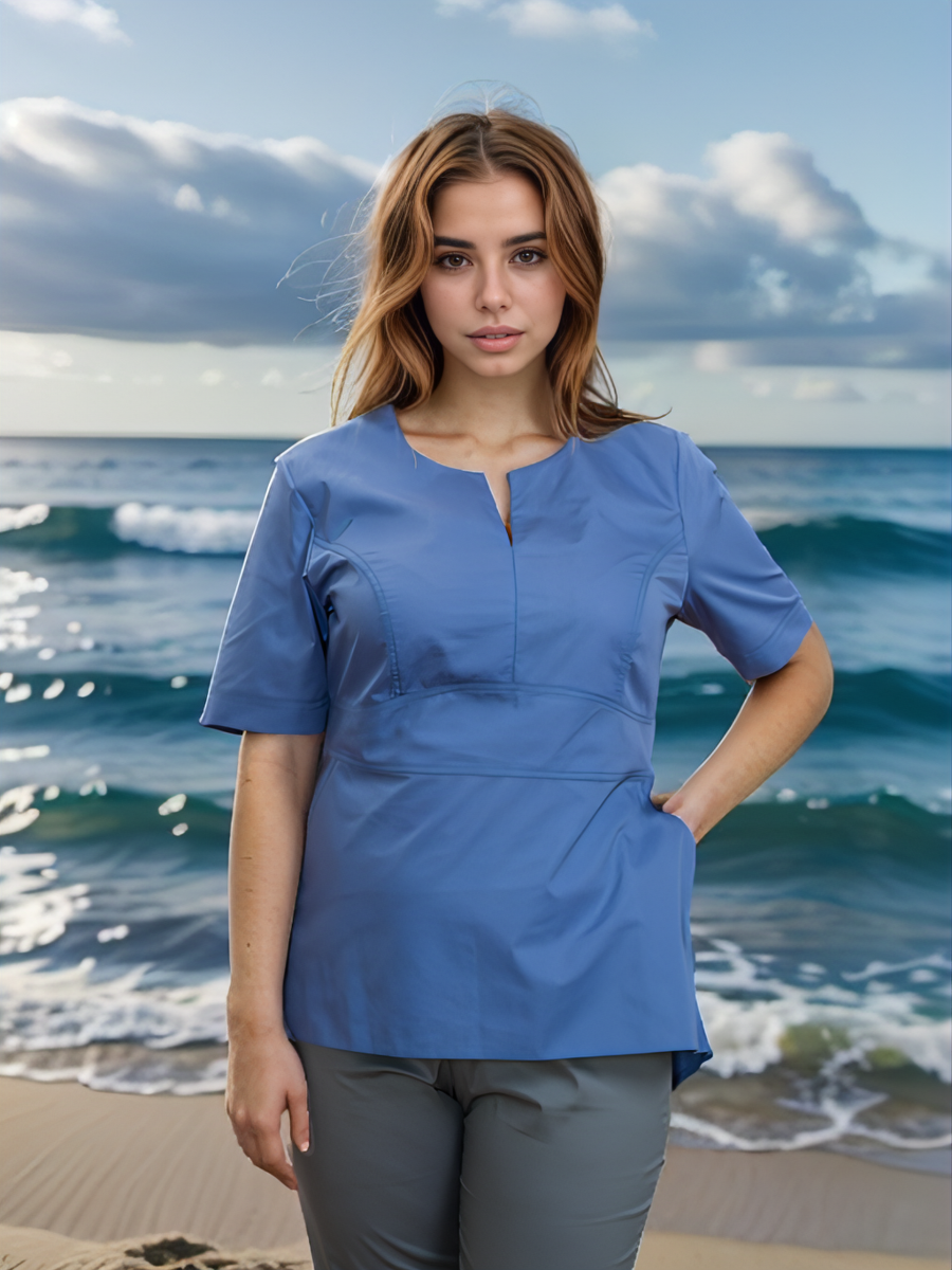 Рубашка мед. жен. М-210 ткань Тиси с коротким рукавом, приталенного силуэта. Без воротника, горловина-фигурная с разрезом впереди. На полочке фигурный втачной пояс, на спинке пояс завязывающийся он позволяет регулировать прилегание блузы по талии. Имеются два боковых кармана. Размеры: 40 - 54.