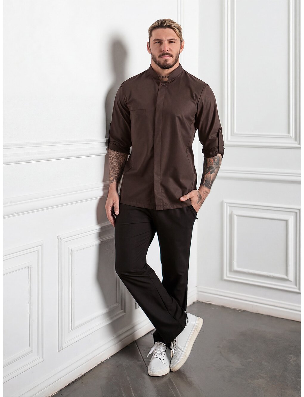 Рубашка мужская GARS, темно - коричневая стильная и универсальная рубашка GARS на пуговицах и верхней кнопке подходит не только для поваров, но и для любых других сфер деятельности.