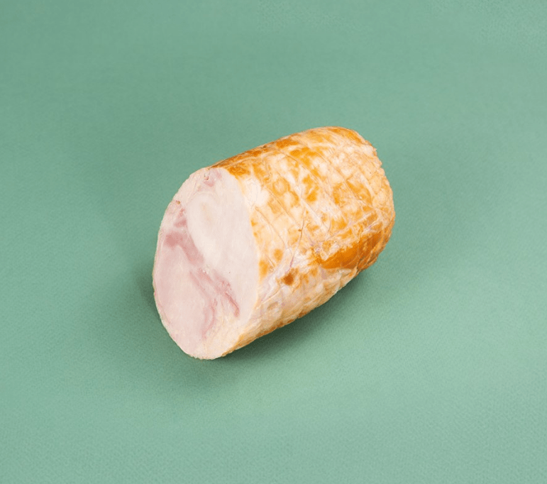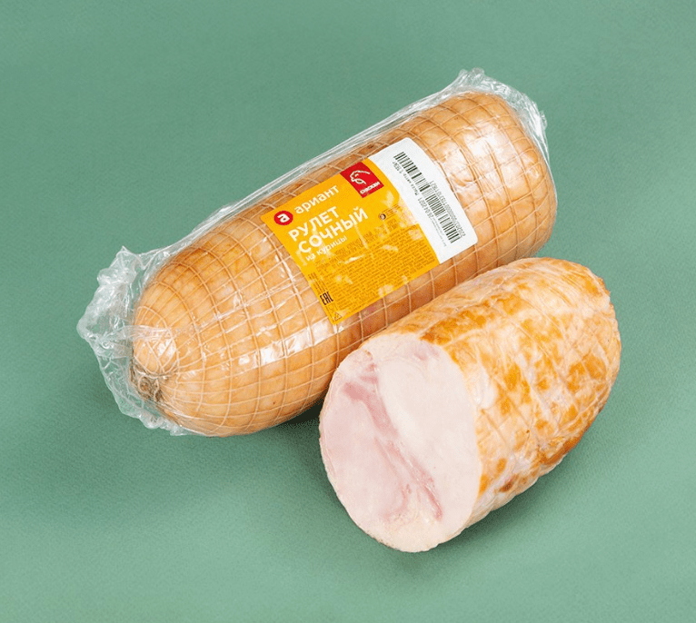 Сочный куриный рулет в сетке, срез фактурный. Отличный продукт для перекуса и для сервировочной нарезки к праздничному столу.
