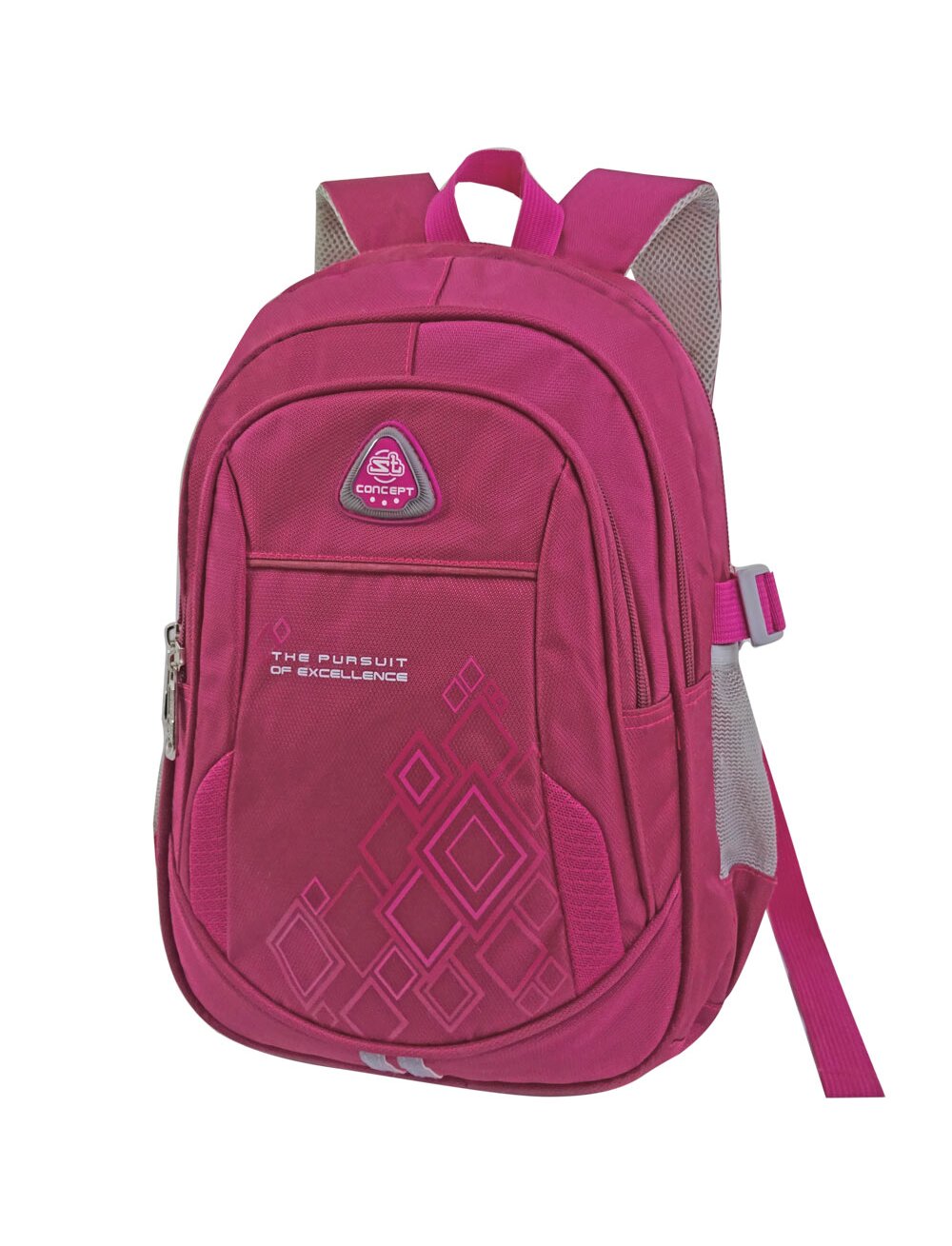 Рюкзак К1605 роз материал — полиэстер. 3 отделения на молнии, в основном отделении карман под тетради, карман на молнии, на передней стенке карман на молнии, 2 боковых кармана на сетке, спинка уплотненная, боковые стяжки на фастексах, лямки регулируемые, уплотненные на сетке. Петелька для вешалки, ручка для переноски.