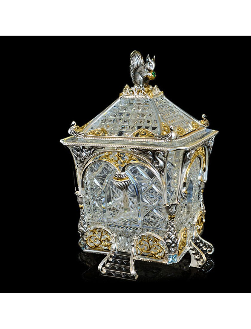 Сахарница "Белочка" - это изысканное столовое изделие, выполненное из хрусталя и обрамленное серебром, с декоративным изображением белочки ( из сказки Пушкина) на крышке. Она предназначена для хранения и подачи сахара к столу, сочетая функции посуды и украшения интерьера. В исконно русских традициях здесь изображены сюжеты сказки, символизирующие борьбу добра со злом. Строгие архитектурные элементы оживляются золоченым растительным орнаментом, что создает гармоничный ансамбль творений природы и человека. В центре внимания, конечно же, главный персонаж сюжета - белочка. Она с большой ловкостью разгрызает свои золотые орешки, вынимая при этом драгоценные изумруды.Как на настоящее чудо, свершившееся в сказке, можно смотреть на эти изделия. Но это не мешает использовать их по назначению - крышка сахарницы удобно открывается и сладости из такого хрустального домика покажутся намного вкуснее. А ложечки придадут неповторимый вкус праздничному чаепитию или чашечке кофе с друзьями. Технологии при создании изделия - литьё, золочение, оксидирование. Материал - серебро 925 пробы, хрусталь Размер - 114*114*165 мм. Вес изделия - 1000 г.