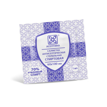 Салфетка спиртовая инъекционная АСЕПТИКА пропитанна спиртовым раствором (70% этиловый спирт). Салфетка для инъекций предназначена для наружного местного применения в качестве стерилизующего и антимикробного средства, для обработки неповрежденной кожи. Спиртовая салфетка применяется для подготовки операционного поля и мест проколов (внутримышечных и внутривенных инъекций), до и после постановки инъекций, заборов крови, дезинфекции рук, для обработки инструментов и различных поверхностей, а также, как средство личной гигиены для обработки рук с неповрежденной кожей. Размер: 60*100 мм. Изготовлена из спанлейса, плотность 40 г/м.кв.