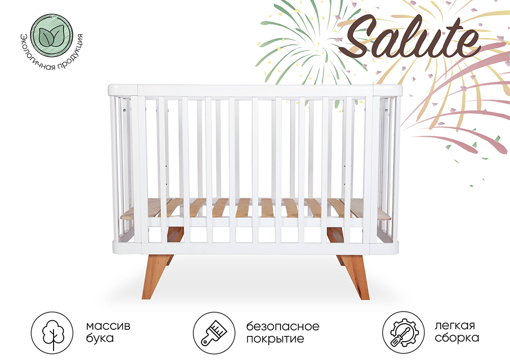 Стильная кроватка Salute для людей с утончённым вкусом. Изготовлена из натуральных материалов - цельного массива бука. Бук относится специалистами к категории ценнейших пород древесины. • Имеет высокую плотность. Прочный материал, который не ссыхается как береза, не выделяет смолу и не расслаивается как сосна. • Экологичность и безопасность, что особенно актуально для детской мебели. • Способность во время производственной сушки сохранять первоначальный внешний вид без растрескивания. • На срезах бук имеет очень красивый природный узор, что позволяет мебели из него иметь оригинальный и очень красивый окрас. • Способность бука гнуться без заломов и растрескиваний. Для максимального комфорта мамы и малыша, спальное место регулируется на трех уровнях высоты. Ортопедическое реечное ложе кроватки обеспечивает вентиляцию матраса со всех сторон. Матрас в детскую кроватку стандартного размера 120х60 см. Купить нужный матрас не составит труда. Скругленные детали кровати исключают наличие острых углов. Расстояние между ламелями кроватки – 7,3 см, что соответствует требованиям стандарта ГОСТов. Покрыта колыбель качественной эмалью на водной основе, разрешенной для детской мебели. Все сделано для максимальной безопасности детей. Дизайн кровати разработан в стиле минимализм, с ретро нотками в современном исполнении. Такая кроватка станет стильным аксессуаром в детской комнате. Простая и понятная печатная инструкция сделает сборку детской кроватки легкой и быстрой. Советуем приобрести дополнительную опцию «продольный маятниковый механизм с фиксатором качания», код товара 690538318 Дополнительно • Расстояние от дна до верха кровати: 36 см (1 уровень), 43 см (2 уровень), 52 см (3 уровень) • Размеры ножки (ВхШ): 15x4,8 см • Расстояние между рейками 7,3 см • Маятниковый механизм приобретается отдельно
