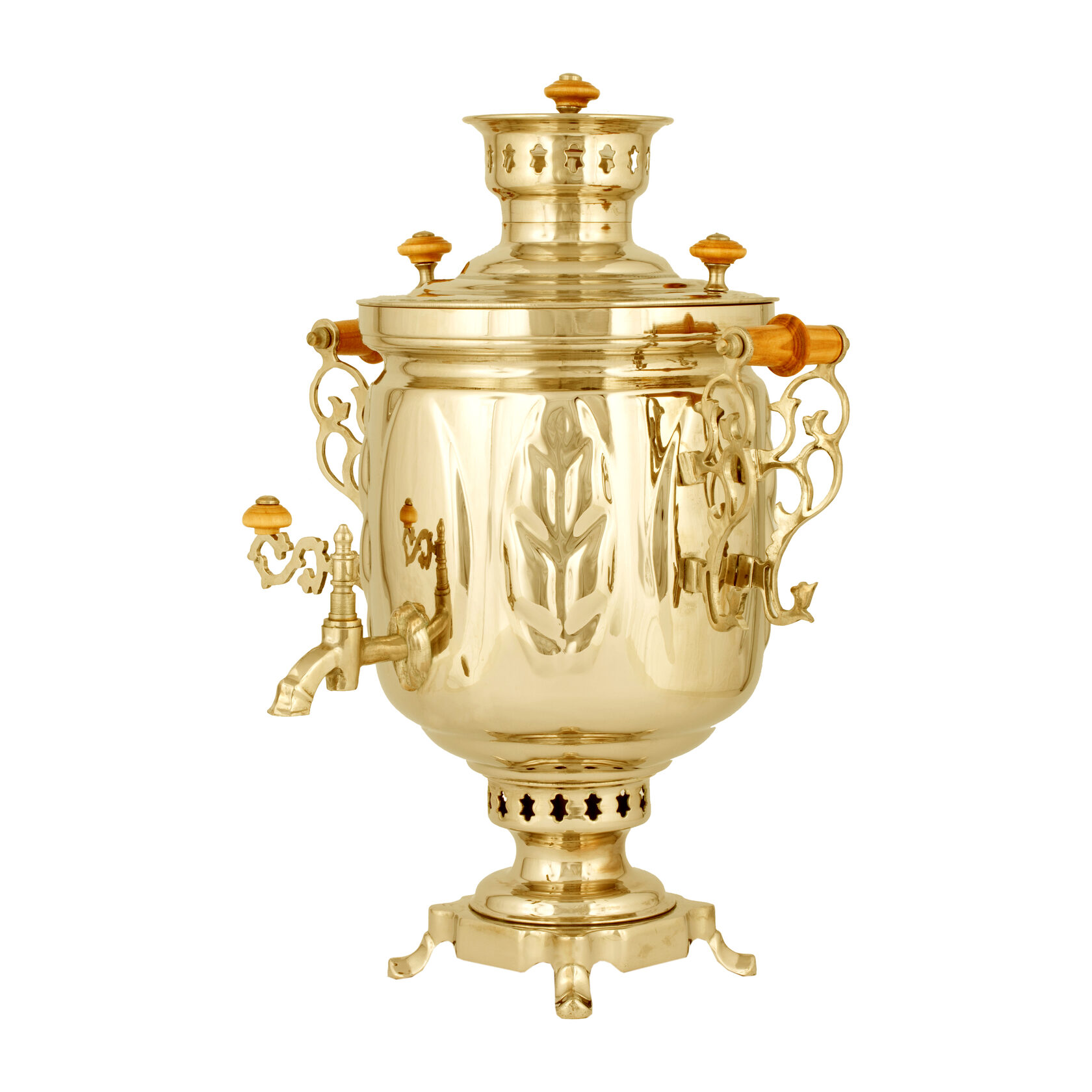 Жаровые самовары становятся все более популярными среди любителей чая. Купить самовар на дровах – это значит обзавестись устройством для подогрева воды без использования электричества. Принцип подогрева воды в таком самоваре осуществляется за счет использования углей. Купить самовар в интернете можно нескольких видов покрытия: Латунное (под золото). На изделиях из латуни возможны потемнения на поверхности, обусловленные физико-химическими свойствами металла. Никелированное (под серебро). Купить новый самовар на углях – это значит купить изделие из цельного листа латуни. Но так как латунь имеет свойство окисляться в процессе эксплуатации, завод «Штамп» покрывает их слоем никеля, облегчая работу по уходу. Если вам нужно жаровое устройство для подогрева воды, и вы не знаете где можно купить самовар, то наш интернет-магазин предлагает изделие на 5 л в форме банки напрямую от производителя. Самовар изготовлен из качественных материалов, имеет красивые декоративные ручки и соответствующий краник, через который удобно наливать воду. Гарантия от производителя 2 года. Инструкция по растопке самовара. Объем: 5 л Форма: Банка Материал: Латунь ШxВxГ: 328x530x300 мм Вес: 5700 г