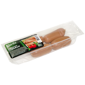 Сардельки "Говяжьи" 0,4 кг варёные изделия из натуральной говядины с добавлением кориандра и чёрного перца.