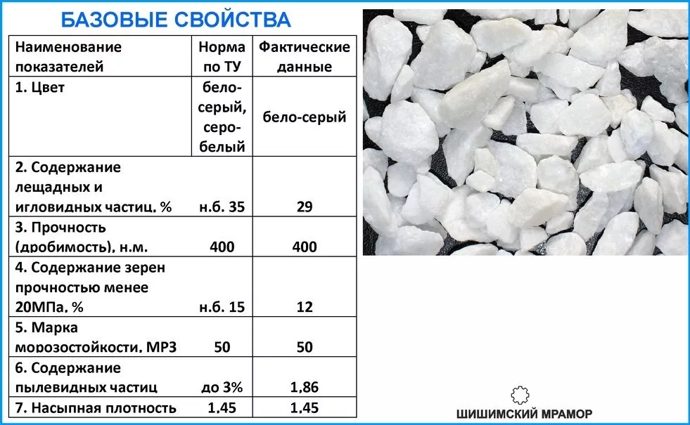 Ед. Измерения: Навалом м3Свойства и применение мраморного щебняМраморный щебень- это природный, радиобезопасный, искробезопасный и пожаробезопасный материал. Радиобезопасность выпускаемой продукциии контролируется ежегодный лабораторным испытанием сырья.Полы с мраморным щебнем не образуют искр при падении и ударах металлическими предметами. Полы с мраморным щебнем пожаробезопасны и огнестойки.Главные свойстваМорозостойкость высокая, Запыленность низкая, Экологичность, Декоративность, Низкая степень радиоактивности, Огнестойкость, Длительный срок эксплуатации, Химическая стойкость.Если говорить о средних фракциях доломитового щебня, то их применяют в бетонном строительстве, черной металлургииПроизводство строительных материалов и ведение земляных работ также не обходится без мраморного щебняНа химическом уровне мраморный щебень схож со смолистыми связующими и благодаря этому, появилась возможность увеличить время эксплуатации асфальтобетонных дорог. Поэтому добавление щебня песка в состав дорожного покрытия вполне обосновано.