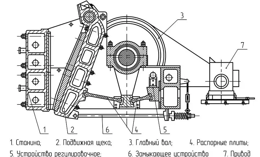 Щековые дробилки - это тип оборудования, который используется для измельчения твердых и хрупких материалов, таких как горные породы, руды и шлаки, методом сжатия. Для этого одна из двух дробящих щек остается неподвижной, а другая совершает возвратно-поступательные движения, постепенно измельчая подаваемый материал до нужной фракции. В зависимости от кинетических способностей щековые дробилки можно разделить на две основные группы: дробилки с простым движением подвижной щеки, в которых движение от кривошипа к подвижной щеке передается определенной кинетической цепью; при этом траектории движения точек подвижной щеки представляют собой части дуги окружности; дробилки со сложным движением подвижной щеки, кривошип и подвижная щека которых образуют единую кинетическую пару; траектории движения точек подвижной щеки представляют собой замкнутые кривые, чаще всего эллипсы.