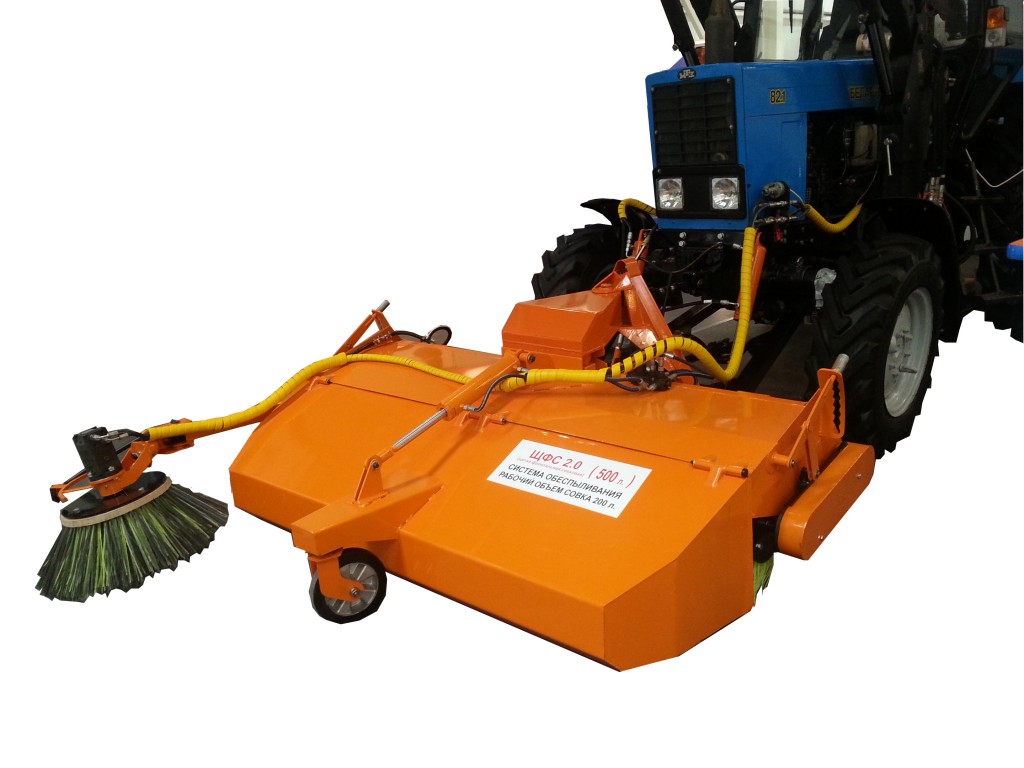 Передняя щетка с бункером, при лотковой щеткой и системой увлажнения. Конструкция быстросъемная на переднюю навеску НУ-2 . Устанавливается на все трактора МТЗ 82/80. Привод основной щетки и при лотковой щетки от гидросистемы трактора. Система пыле подавления с емкостью 500 л.