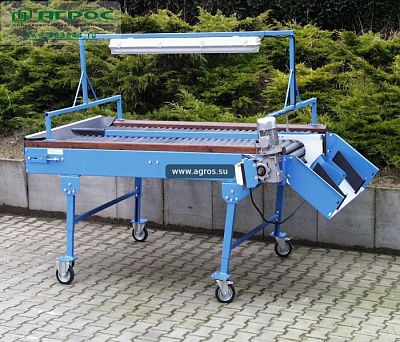 Служит для ручного сортирования клубней картофеля, лука и других клубнеплодов овальной формы. Медленно вращающиеся ролики из ПХВ обеспечивают многократное вращение клубней и дают возможность их тщательного селекционирования. Рама стола опирается на 4 ногах с регулируемой высотой оснащенных двумя колесами для поворачивания с тормозом. На раме имеется освещение.