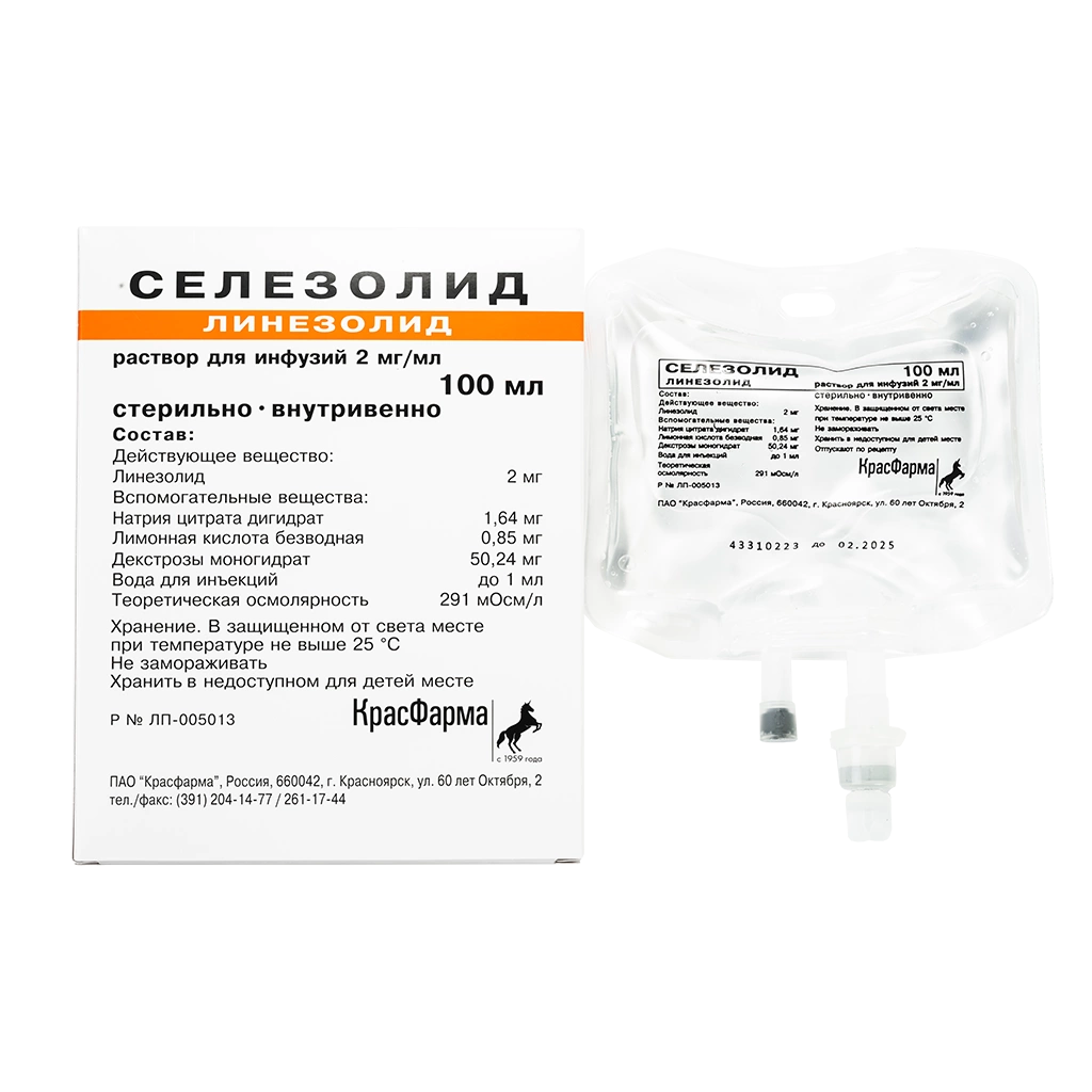 Селезолид - это синтетический антибактериальный препарат группы оксазолидинонов, активный компонент которого - линезолид. Применяется для лечения тяжелых грамположительных инфекций (пневмонии, инфекции кожи и мягких тканей). Включен в схемы терапии МЛУ-ТБ. Поставляется в виде прозрачного раствора для инфузий (2 мг/мл) в полимерных контейнерах по 300 мл.