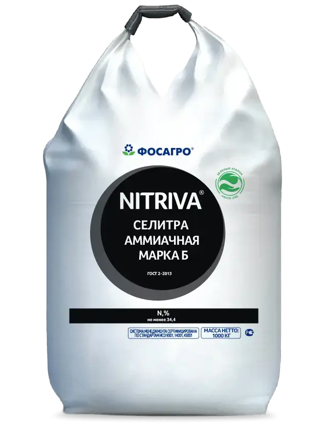 Селитра аммиачная марка Б - концентрированное гранулированное азотное удобрение для обеспечения сельскохозяйственных растений азотом в ранневесенний период, а также после укосов и стравливания для стимулирования отрастания, активного роста и развития зелёной массы растений. Содержит в своём составе аммонийный и нитратный азот в равных количествах, является универсальным и высокоэффективным минеральным удобрением. При длительном применении оказывает подкисляющее действие на почву, в связи с чем необходимо периодически проводить известкование. Поставляется в гранулированном виде, упакованная в мешки весом по 50 кг или в биг-беги (большие мешки).