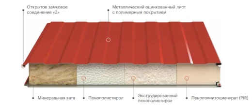 Сэндвич панели стеновые, пенополиизоцианурат (пир) 100 мм, 1000 мм - это трехслойный строительный материал, используемый для быстрого возведения стен зданий, обладающий хорошими теплоизоляционными свойствами и повышенной огнестойкостью благодаря специфике наполнителя. Он подходит для строительства промышленных и административных зданий, логистических центров, холодильных камер и объектов агропромышленного комплекса. Слои - оцинкованная сталь с покрытием, пенополиизоцианурат плотностью 40 кг/м³. Теплопроводность - 0,022 Вт/мК, класс огнестойкости - B-s1,d0.
