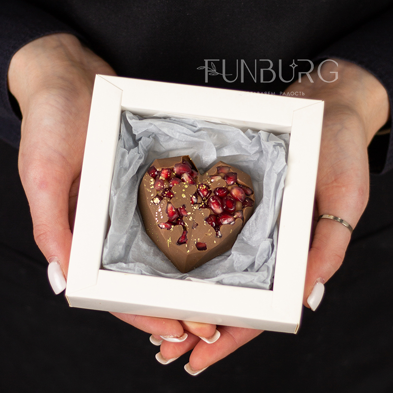 Сердце из вкуснейшего бельгийского молочного шоколада с сочными зёрнами спелого граната, которые так ярко оттеняют нежную текстуру и сладость шоколада! Десерт, который точно стоит попробовать!