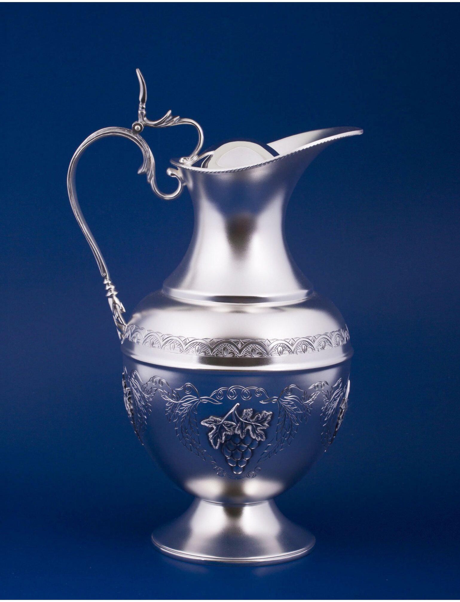 Серебряный кувшин №17 "Виноградная лоза" - это элитный столовый прибор ручной работы, изготовленный из серебра 925 пробы, объемом около 1,2 л. Он украшен чеканкой в виде виноградной лозы, символизирующей изобилие и жизнь. Кувшин используется для подачи вина или воды с крышкой, сохраняя свежесть напитков, и служит статусным подарком. Кувшин украсит любой праздничный стол и сохранит вкус и свежесть напитков. Размер - 250*153 мм. Средний вес - 648 гр.