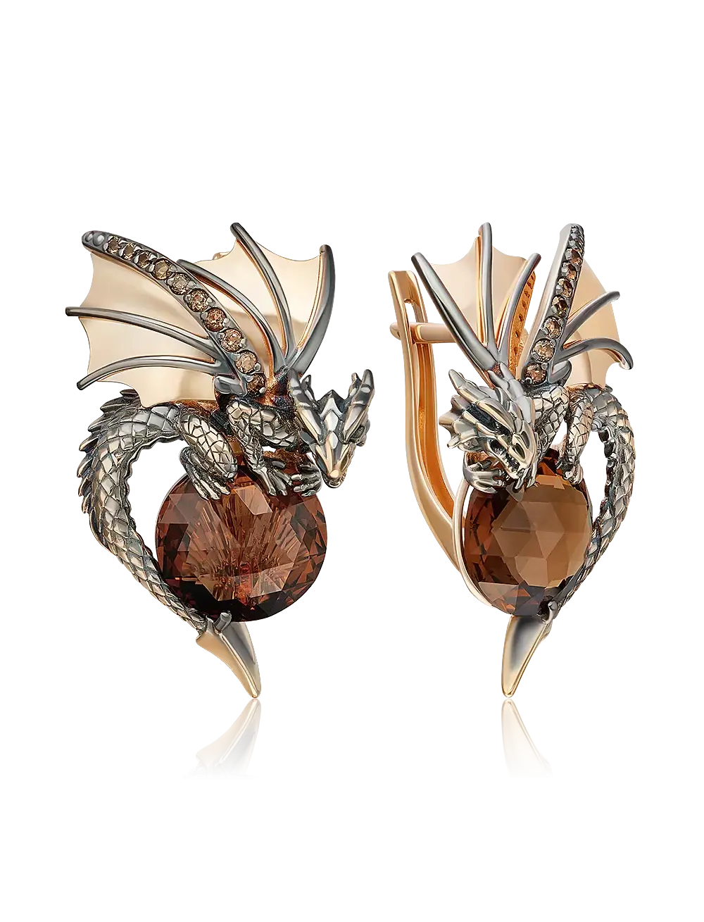 Серьги "Драконы" с английским замком из красного золота с цитрином и кварцем дымчатым выполнены в готическом и анималистическом стилях. Образ дракона символизирует могущество, благородство, защиту, богатство, удачу. Покрытие чёрным родием усиливает реалистичность ювелирного образа. Блеск крупного цитрина и миниатюрных дымчатых кварцев добавляют колорит и эффектность украшению. Закрепка камней и родирование выполнены вручную. Расправленные крылья дракона полностью прикрывают место прокола. Серьги станут выразительным и символичным акцентом образа. Средняя масса - 7.97 г.