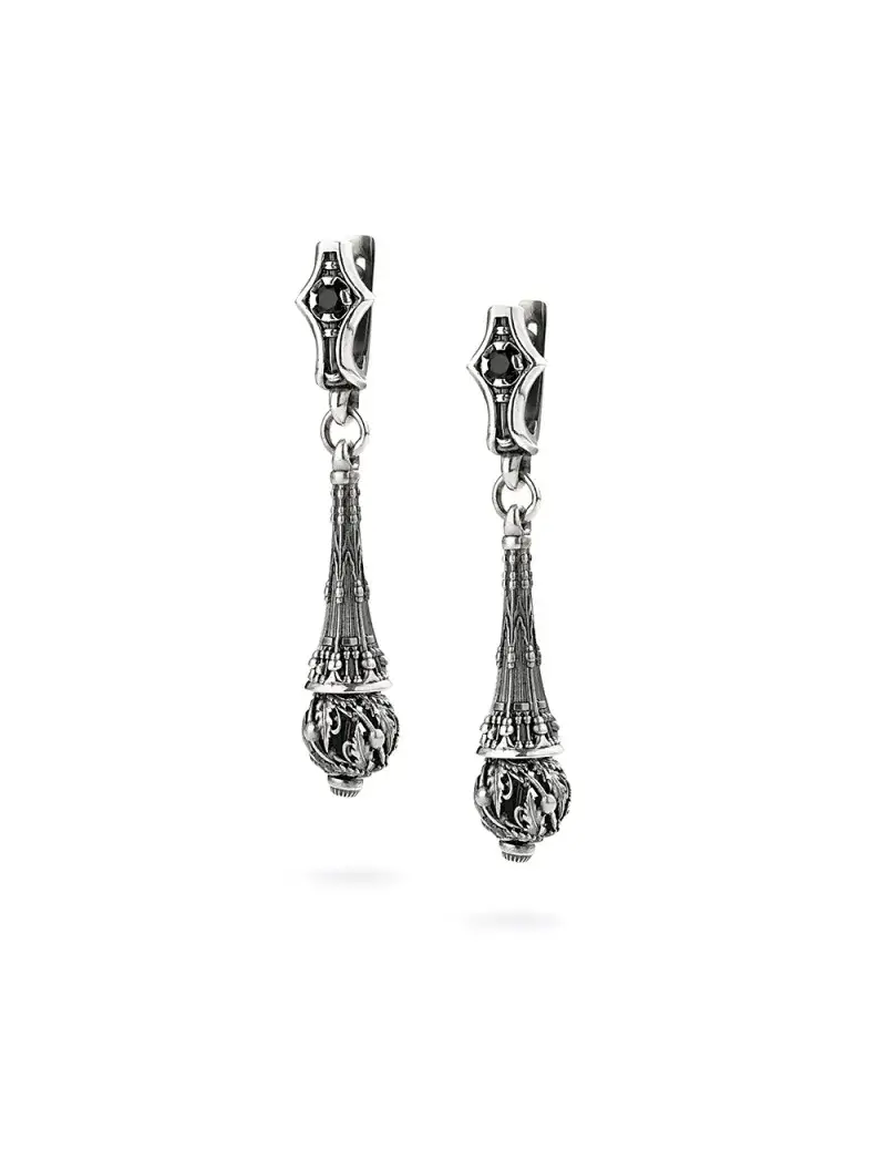 Серьги "Gothic lite" - это удлиненные серьги в готическом стиле из серебра 925 пробы, вставки: чёрная шпинель. Предназначены для создания элегантного, но мрачного образа, сочетая строгую готику с повседневной легкостью. Серьги изготавливаются с классическим английским замком и конусообразной подвеской, декорированной готическими арками и колоннами, и ажурными серебряными бусинами с лиственным узором.
