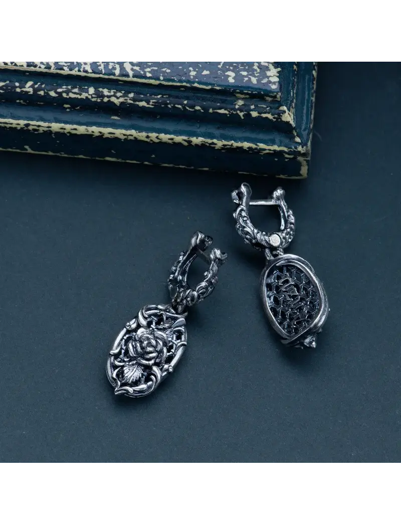 Серьги "Rose garden" - это серьги из серебра 925 пробы. Узкие серьги-кольца, стилизованные под изогнутую кость, декорированную лиственным орнаментом. Они созданы для подчеркивания женственности, нежности и добавления свежести в образ. Подвески серег представляют собой решетчатые звенья, несущие на своей внешней поверхности орнаментальную композицию из крупного цветка розы с листьями и травами, а внутренней - название бренда. Закрывается изделие на классический английский замок.