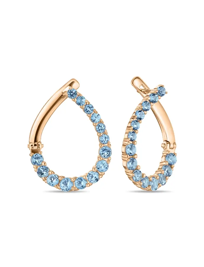 Серьги с топазами - это ювелирные украшения с драгоценным камнем, чаще всего голубого, прозрачного или желтого цвета, оправленные в золото или серебро. Они носятся для придания образу нежности и элегантности, подчеркивания цвета глаз, а также в качестве оберега, символизирующего мудрость, дружбу, верность и душевное спокойствие. Топаз - достаточно твердый, но хрупкий минерал, который может поблекнуть на прямом солнечном свету, поэтому украшения лучше носить вечером и беречь от падений. Металл - красное золото 585 пробы. Вес - 3,08 гр. Вставки - 28 топазов огранки "Круглая", весом - 1.789 карат.