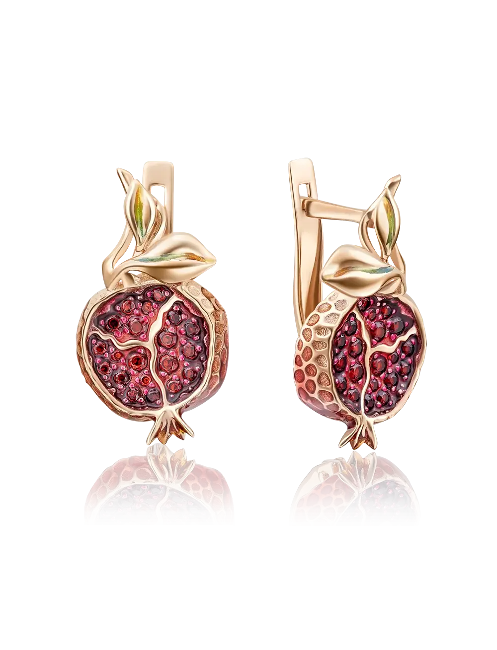 Серьги "Спелый гранат" с английским замком из красного золота с гранатами и эмалью выполнены в стиле флористика. Образ плода гранатового дерева символизирует плодородие, процветание, супружество. Инкрустация натуральными гранатами и роспись эмалью добавляют колорит и реалистичность ювелирному образу. Закрепка камней и эмалирование выполнены вручную. Украшение станет ярким и эффектным штрихом образа: как повседневного, так и праздничного или вечернего. Вставка - гранат (природный). Средняя масса - 4.01 г.